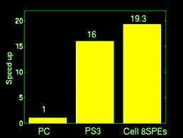 Une application optimisée pour les Cell comme Cell MD atteint 30 Gflop/s sur un processeur Cell (environ 25 Gflop/s sur la PlayStation3 en raison du fait que seuls 6SPE sur 8 peuvent être utilisés). Avec 8 SPE, (l'accélération est 19 fois équivalente à celle d'un AMD Opteron de 2Ghz).
